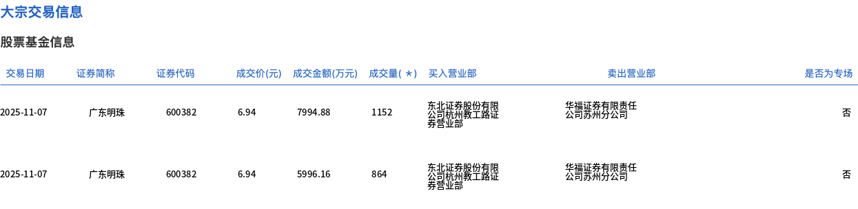 11月7日,广东明珠大宗交易成交2016万股,成交额1.4亿元,占当日总成交额的32.9%,成交价6.94元,较市场收盘价7.81元折价11.14%。